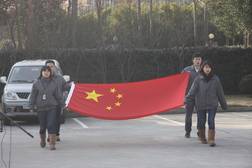 升旗仪式由飞奥团支部书记李华珺主持,全体员工整齐列队等待,屏气凝神静静盼着国歌奏响那一激动人心时刻的到来。9时,升旗仪式正式开始。迎着初升的朝阳,升旗手们精神抖擞、迈着整齐矫健的步伐护卫着国旗来到旗杆下。伴随着《义勇军进行曲》振奋激昂的旋律,升旗手用娴熟的动作升起国旗。冉冉升起的五星红旗吹响了新一年工作的号角,全体人员肃然而立,仰望鲜艳的五星红旗,心中默默唱响国歌,一双双眼睛里显露出无限崇敬,一颗颗心中激荡着无限深情,祝愿祖国在新的一年更加繁荣昌盛,祝福航天能源、上海飞奥能在2012年创造新的辉煌,实现新的发展。