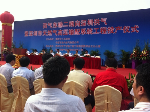 2012年8月1日上午,西气东输二线向深圳供气暨深圳市天然气高压输配系统工程投产仪式(简称供气仪式)在观澜求雨岭门站成功举行。供气仪式由深圳市政府和中石油公司主办,深圳市西气东输二线工程建设联席会议办公室和市燃气集团承办。许勤市长、吕锐锋常务副市长、李廷忠副秘书长和中石油公司李新华副总经理等领导出席了供气仪式。许勤市长宣布西气东输二线深圳段正式供气、深圳天然气高压输配系统工程投产,并点燃了使用西气东输二线天然气的火炬台。深圳市西气东输二线工程建设联席会议办公室沈毅副主任在供气仪式上做了发言。