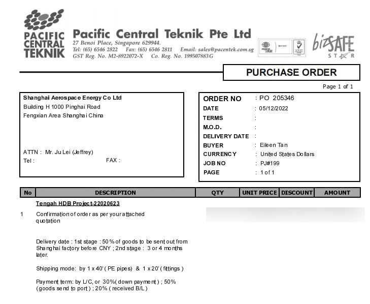 新加坡Pacific Central Teknik Pte Ltd公司冷水管材、管件第一批次项目