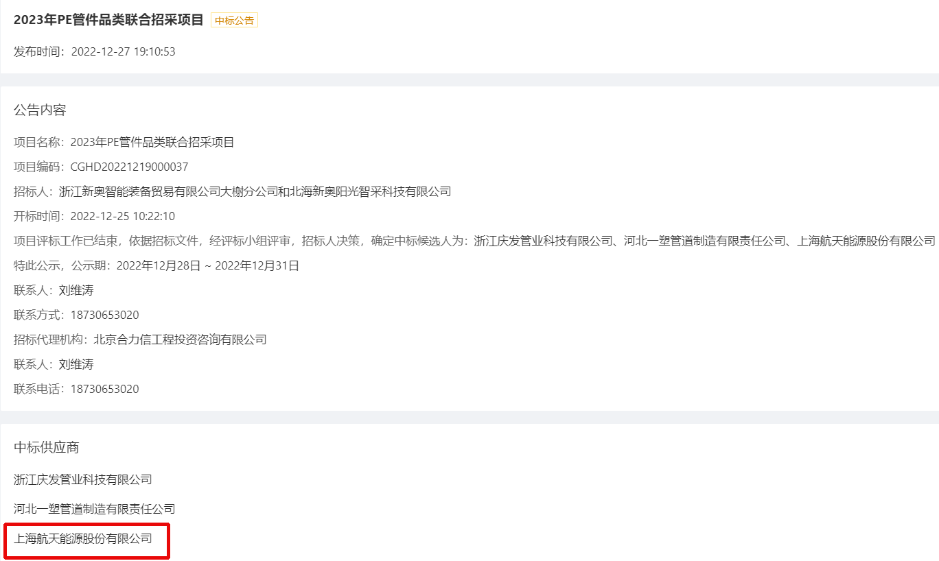 航天能源SG-PE管道事业部抢抓机遇,大力开拓外部市场,接连中标新加坡Pacific Central Teknik Pte Ltd公司冷水管材管件第一批次项目、新奥燃气集团PE管件集采项目。多个项目的接连中标是公司坚持抓牢经营、统筹布局的阶段性成果,有助于公司后续开展业务。