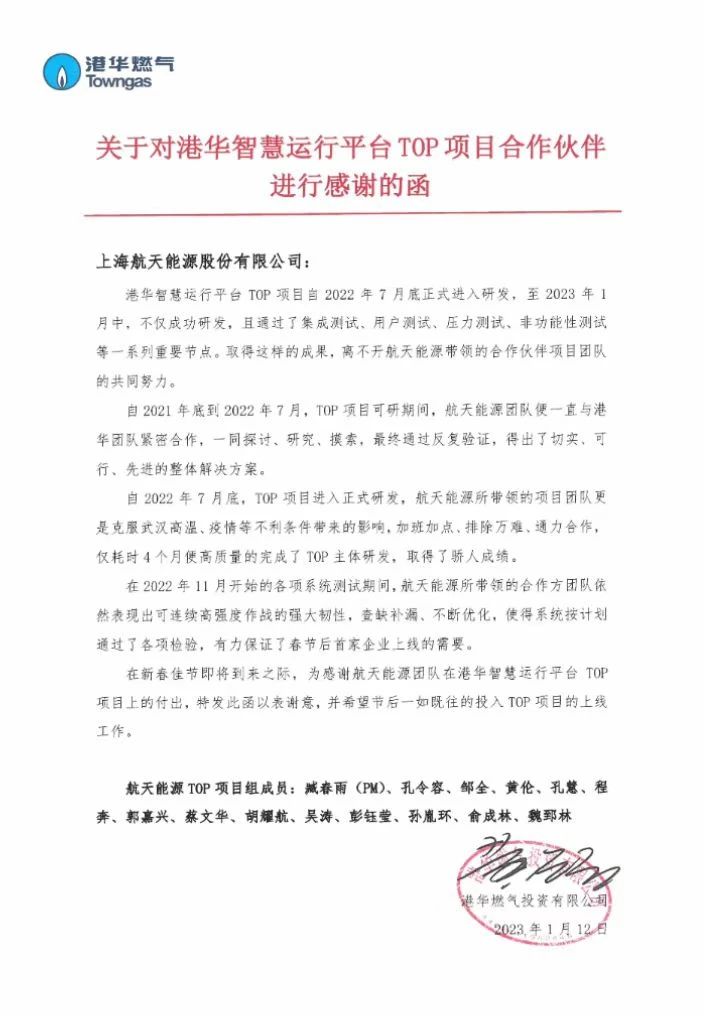 感谢函中,港华燃气表示:航天能源TOP项目团队克服了武汉高温、疫情等不利条件带来的影响,加班加点,排除万难,通力合作,仅耗时4个月便高质量完成了TOP主体研发,这种顽强拼搏的精神值得点赞!