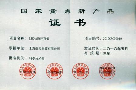 航天能源公司自主研发的LKT-A快开盲板拥有自主知识产权,发明专利申请一项,实用新型专利授权八项。该产品于2008年荣获“上海市重点新产品”称号,现再得殊荣,获得“2010年国家重点新产品”称号。
