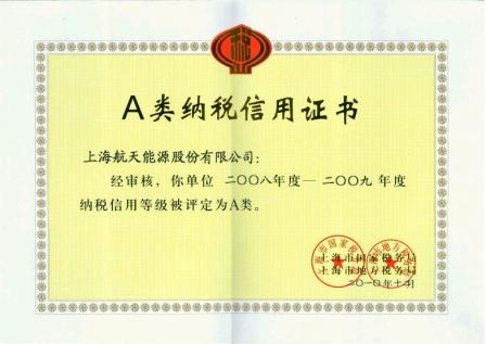 航天能源公司近日获得上海市税务局颁发的A类纳税信用等级证书。