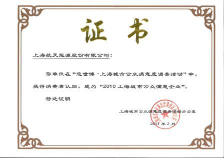 上海航天能源股份有限公司参加由“中国上海”政府网站、东方新闻网站、上海市新闻工作者协会、上海市信息服务行业协会、市民信箱联合主办的“迎世博 上海城市公众满意度调查”活动,最终航天能源公司经推荐审定、专业测评和社会公示,获得消费者认同,进入2010上海城市公众满意企业行列。