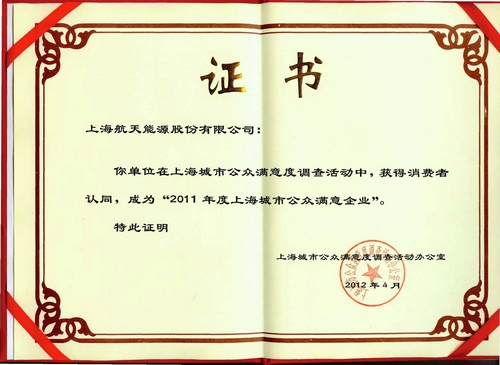 2012年4月,上海航天能源股份有限公司(以下简称航天能源)顺利通过"2011年上海城市公众满意企业"的调查活动,本次活动通过对企业人气口碑(91%的满意度)、业务水平(97%的满意度)、行业诚信(92%的满意度)、社会责任(89%的满意度)等方面的专业调查,在上海政府门户网站进行公示,接受社会检验和监督。目前,在上海市政府网站上进行的测评和调查活动中,航天能源再次获得消费者的认同,进入2011年度上海城市公众满意企业行列。