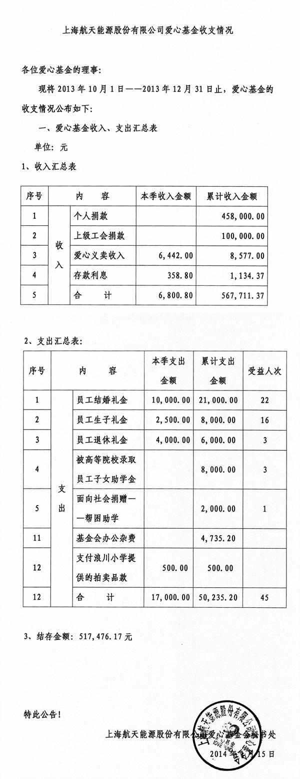 航天能源爱心基金收支情况