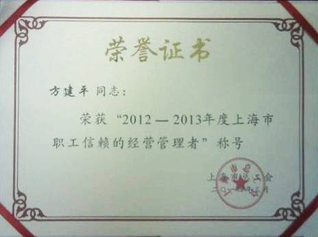 经公司申报,上海市总工会等政府部门审核和实地考察,方建平董事长获得“2012-2013年度上海市职工信赖的经营管理者”荣誉称号。