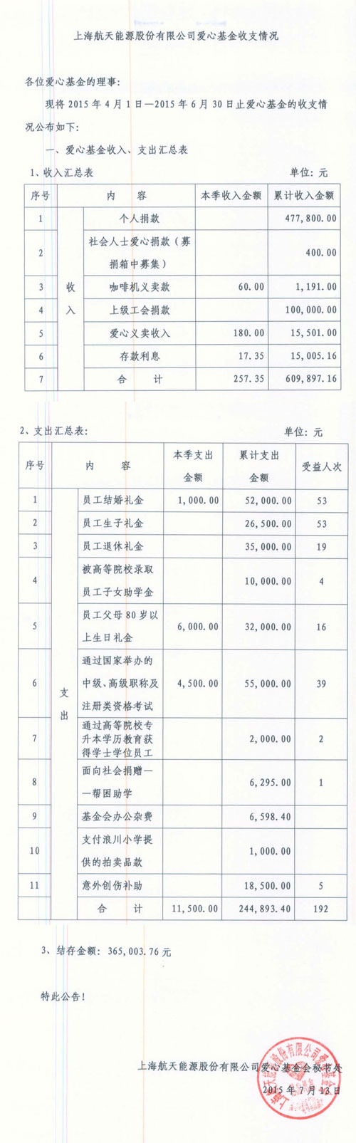 爱心基金收支情况(4月—6月)