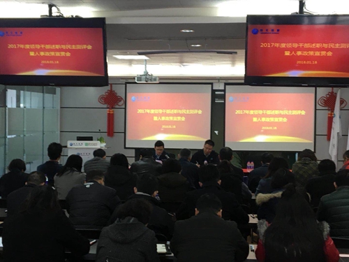 随后,总裁张铁军、党委书记曾凡龙分别进行个人会议述职,全面总结了本年度完成的重点工作、思想学习、廉洁自律等方面的情况、存在的突出问题以及2018年度的工作展望。按照考核方案,领导班子副职以书面形式述职。述职后,与会人员对领导班子和近期新提拔中层、公司党建等方面进行了民主测评。
