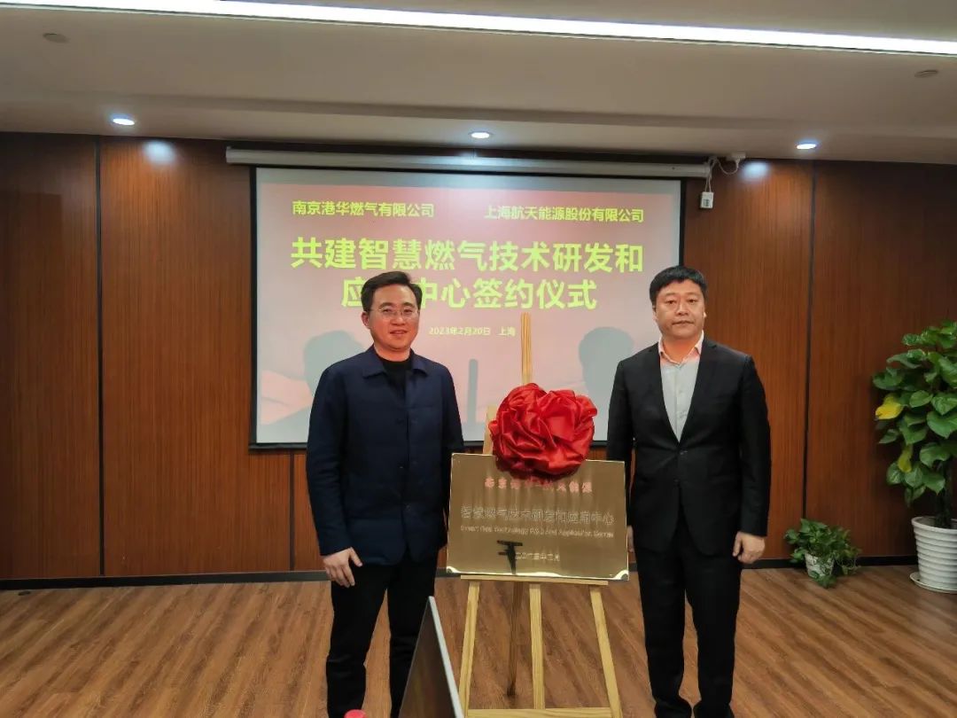 杨翰林董事长与朱伟董事长对“南京港华-航天能源 智慧燃气技术研发和应用中心”进行揭牌。