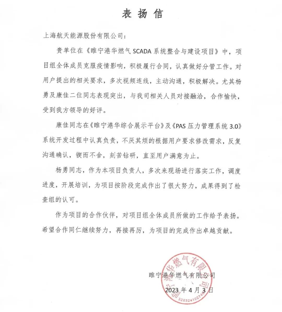 信中,客户方睢宁港华对航天能源在项目中的大力支持表示感谢,充分肯定了在项目实施过程中航天能源团队展现出的专业技术水平和吃苦耐劳的工作品质,获得了睢宁港华团队的一致好评!